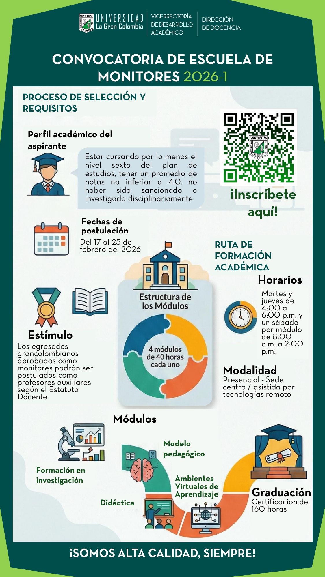 La Escuela de monitores es el programa de formación y profundización académica en el campo de la educación, la pedagogía, la didáctica y la investigación que la Universidad La Gran Colombia brinda a estudiantes postulados y seleccionados como monitores, de cursos de los programas académicos. Así, es una estrategia enfocada a la permanencia estudiantil y al relevo generacional del cuerpo docente, al estar regulada por el Acuerdo 011 del 4 de noviembre del 2015, abordando las dimensiones cognitivas, afectivas y prácticas orientadas a incentivar el espíritu de la docencia a través de acciones de solidaridad y colaboración en los procesos de formación universitaria.
