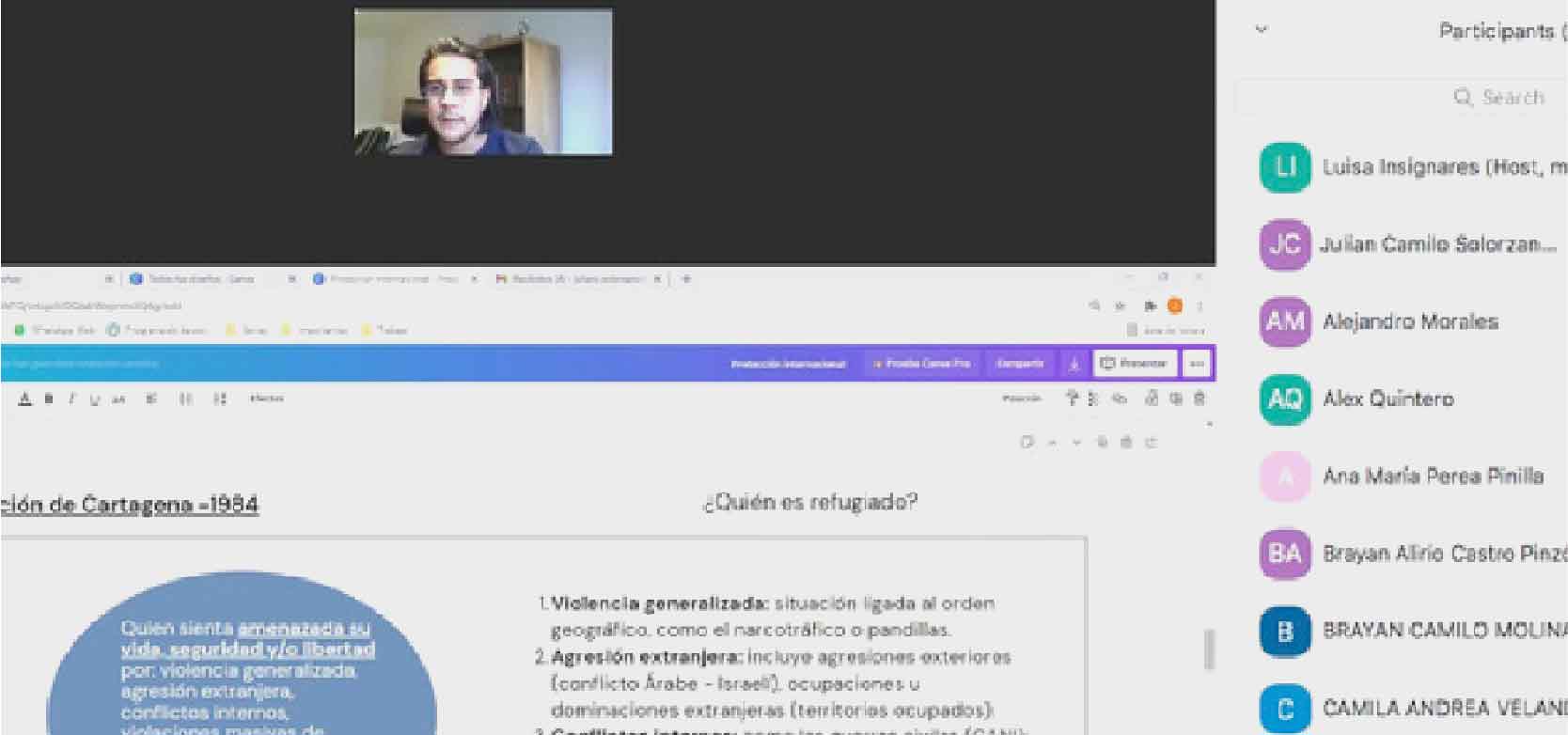 Las capacitaciones llevadas a cabo por el Observatorio de Derechos Humanos sirvieron como elementofundamental para que las personas que participaron de esta práctica nutrieran aún más su espectro deconocimientos, pues de la mano del profesor Julián Solórzano de la Corporación Opción Legal, pudieron obtenerherramientas de apoyo a personas con necesidad de protección internacional en situación de vulnerabilidad.